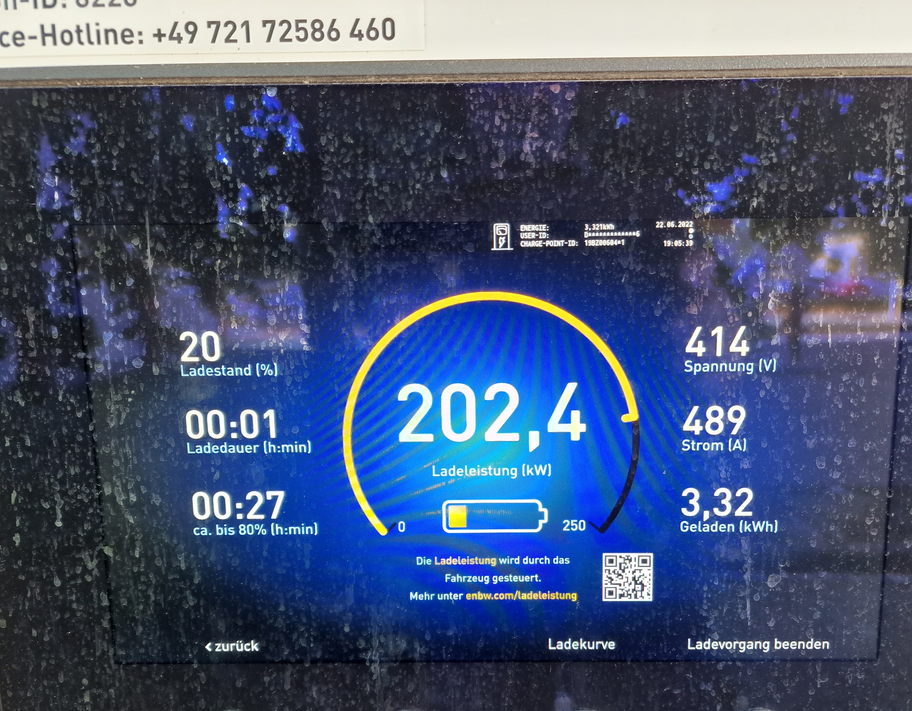 Am Zielort mit 202 kw geladen an EnBW ladestation bei Shelltankstele Giessen, mit 17 % ankommen und ima 6 minuten wahr akku auf 40 %